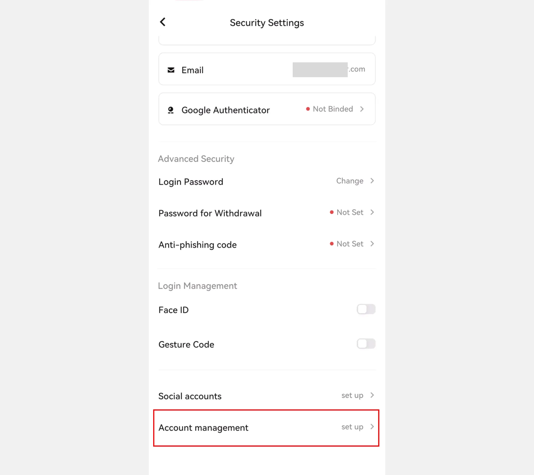 3. [Security Settings] 화면에서 [Account management]를 눌러 주세요.