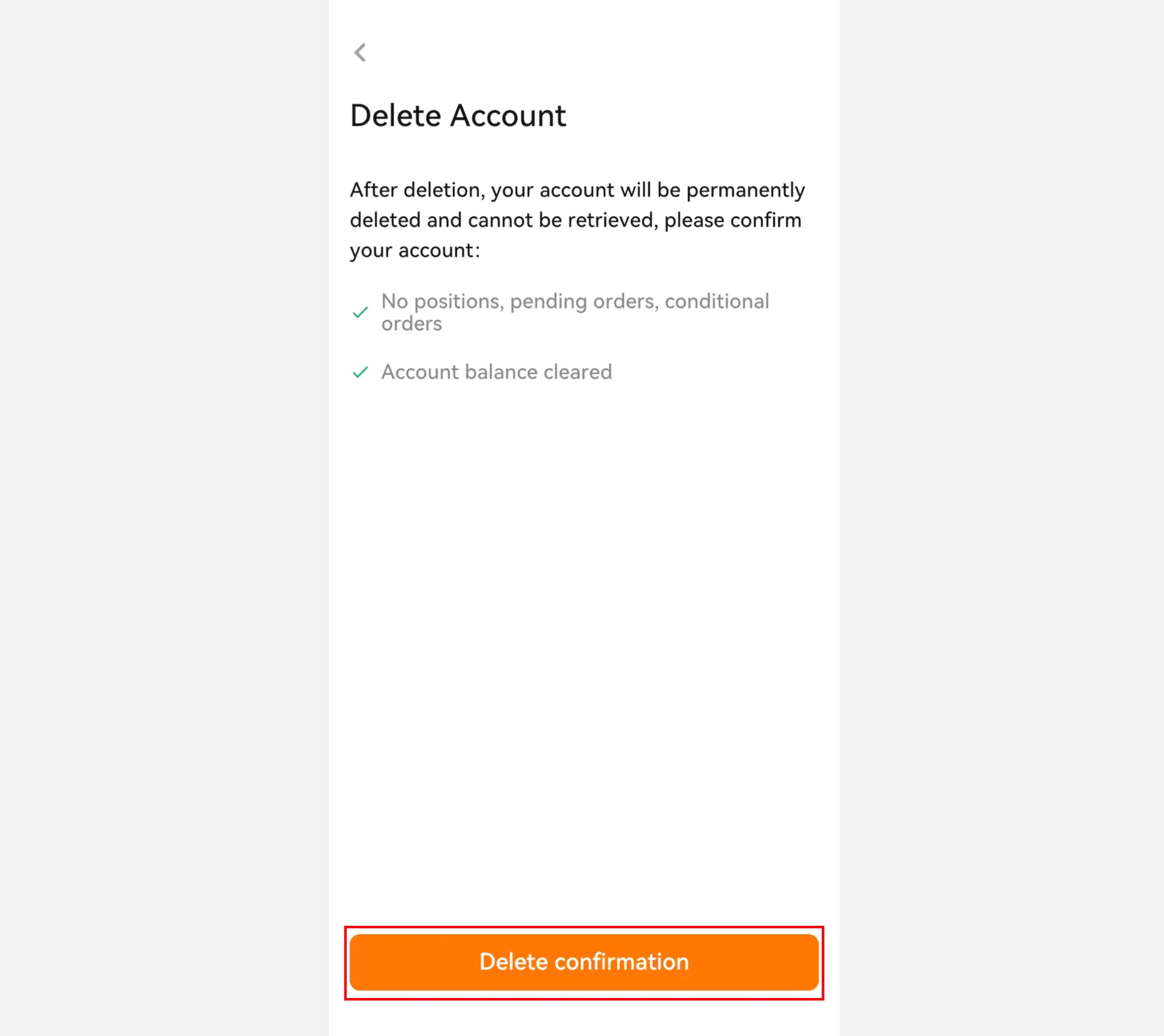 5. 계좌 내 자산 및 포지션 상태를 확인하고 [Delete confirmation]버튼을 누릅니다.