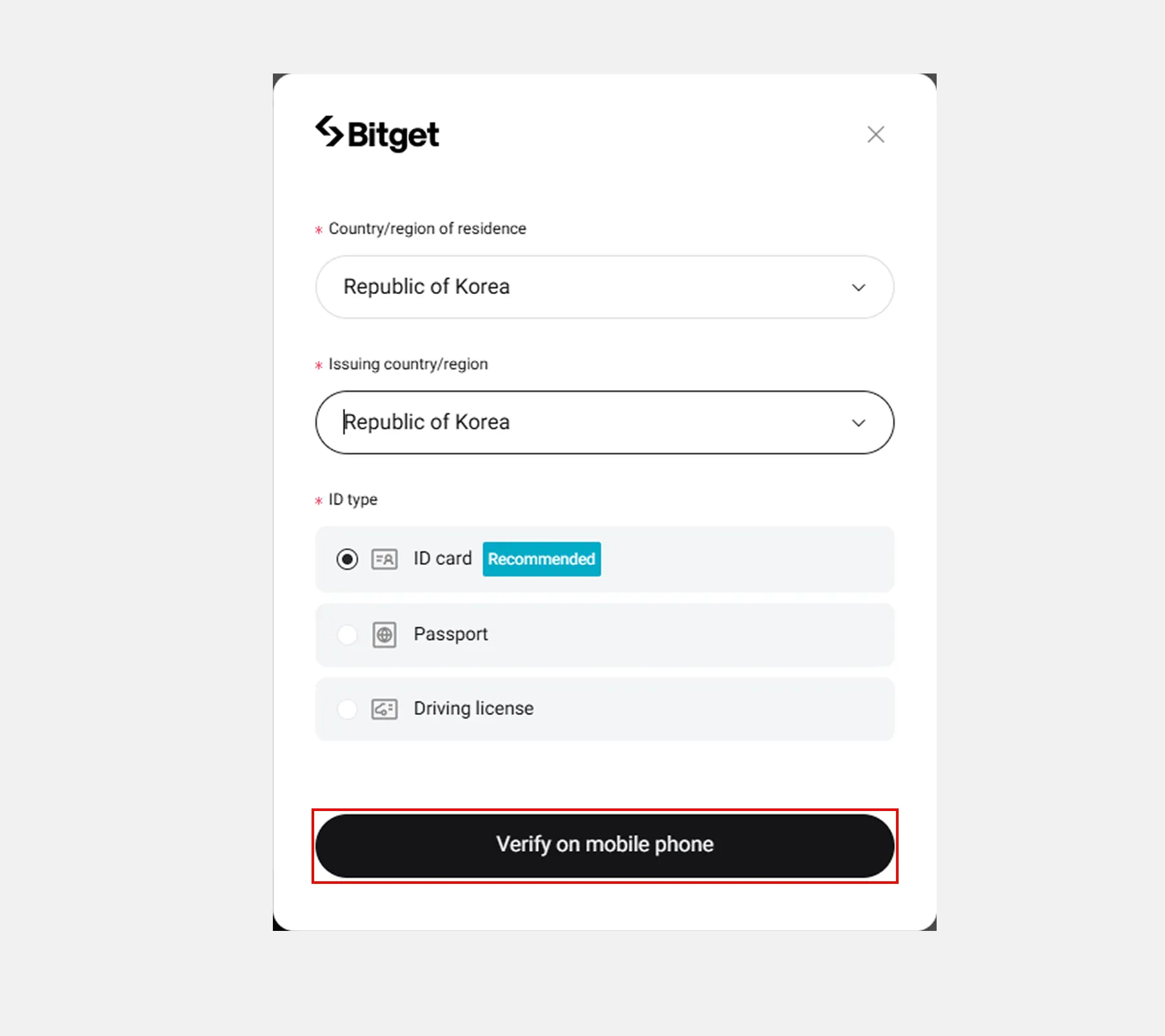 4. 국가 및 신분증 종류를 선택하고 [Verify on mobile phone] 또는 [Continue]를 클릭합니다.