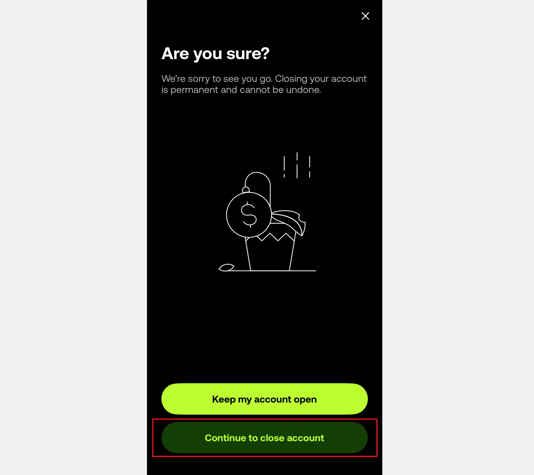 5. 탈퇴 진행을 위해 [Continue to close account]버튼을 선택합니다.