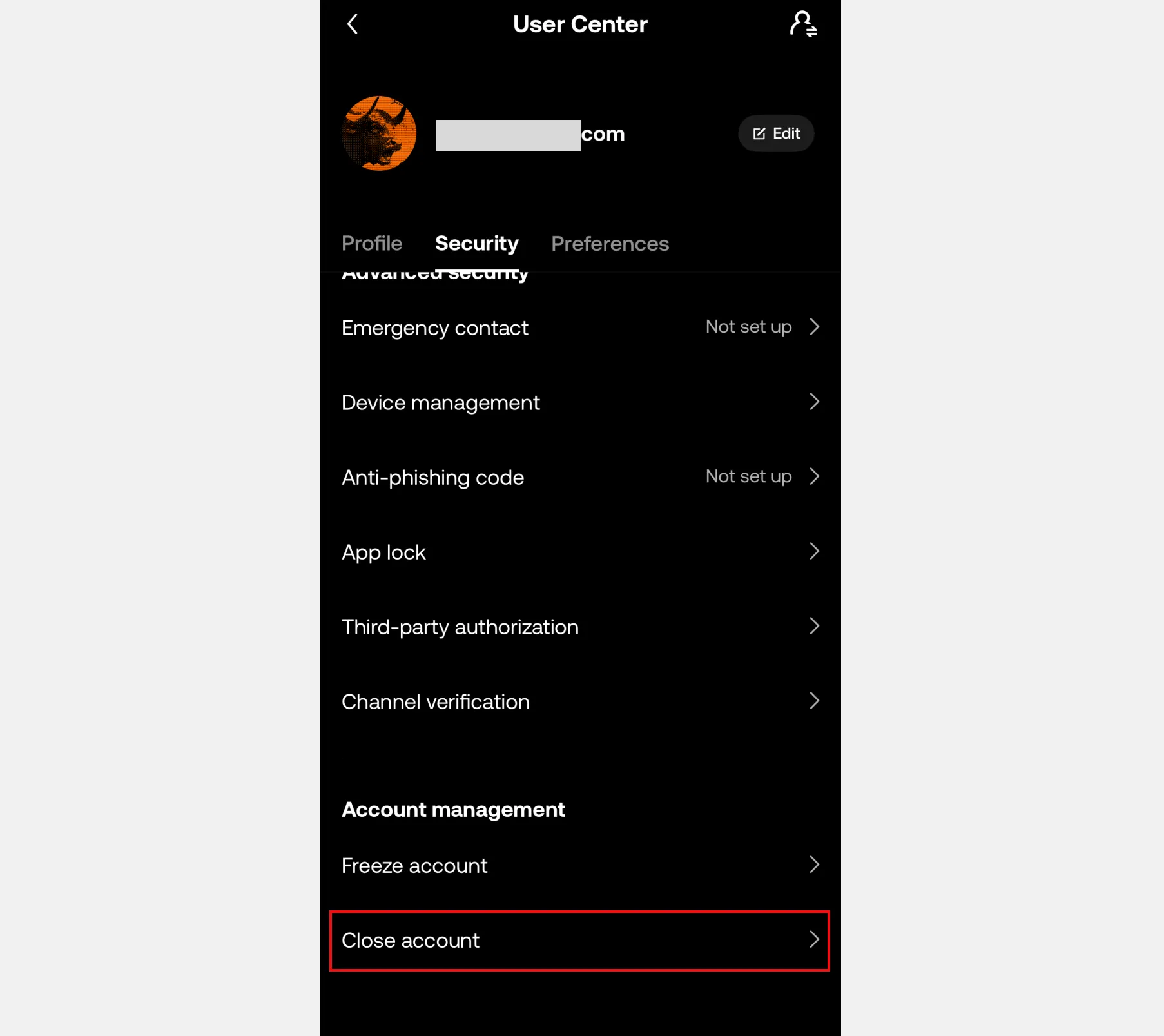4. [Security]탭 하단 [Close account]를 누릅니다.