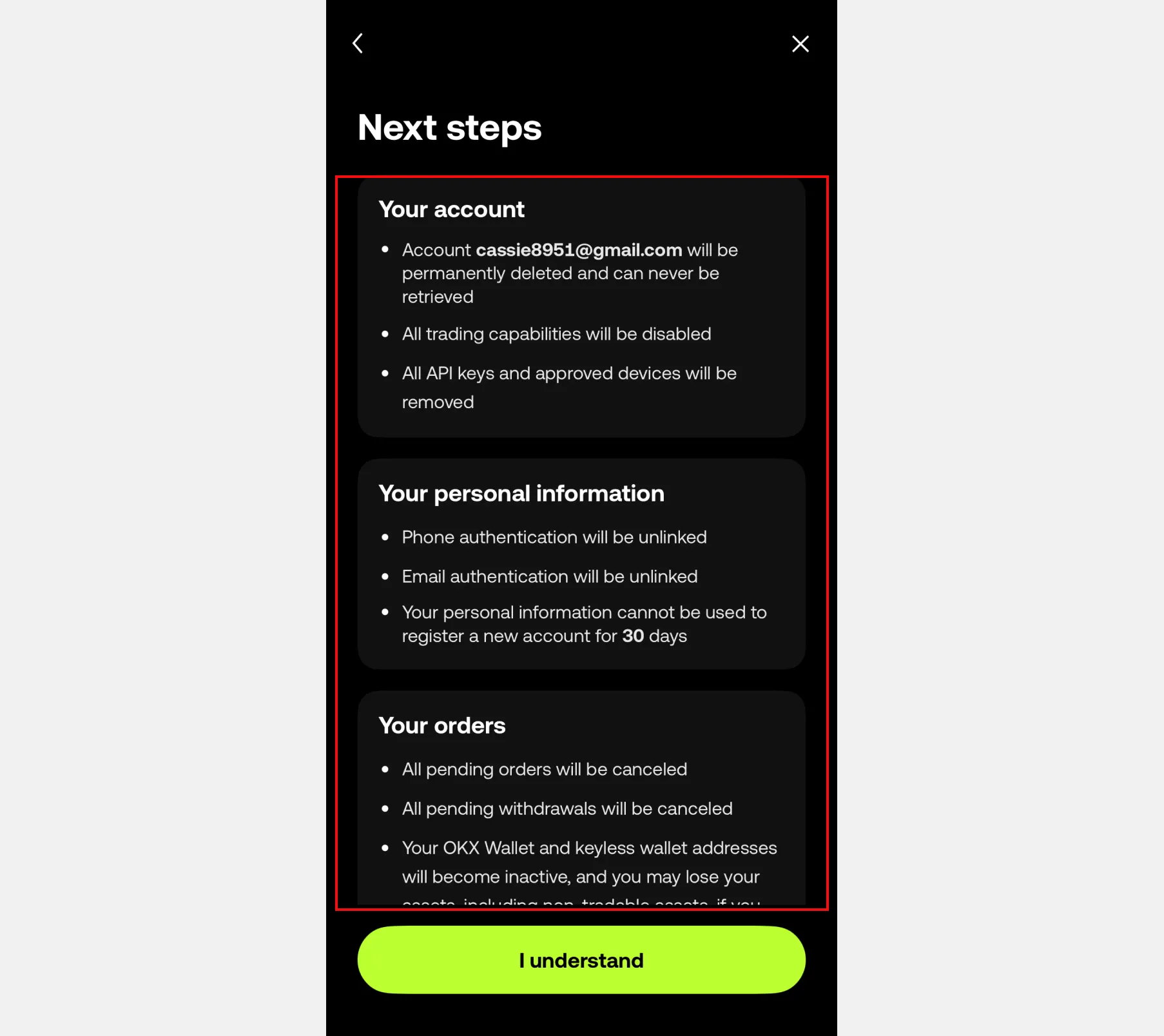 7. 탈퇴를 위한 안내사항을 확인하고 [I understand]를 누릅니다.