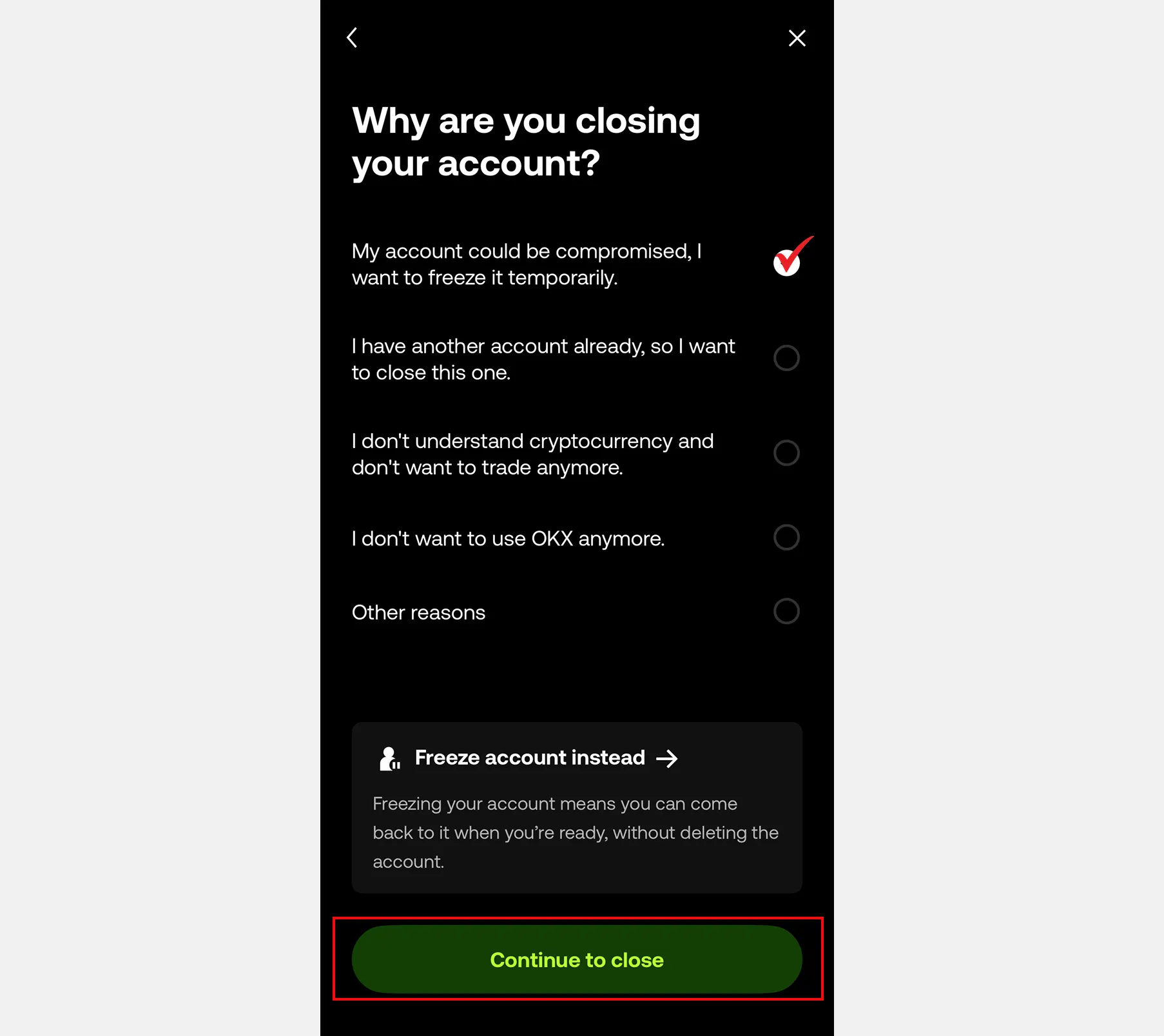 6. 탈퇴 사유를 선택 후, [Continue to close]를 눌러주세요.